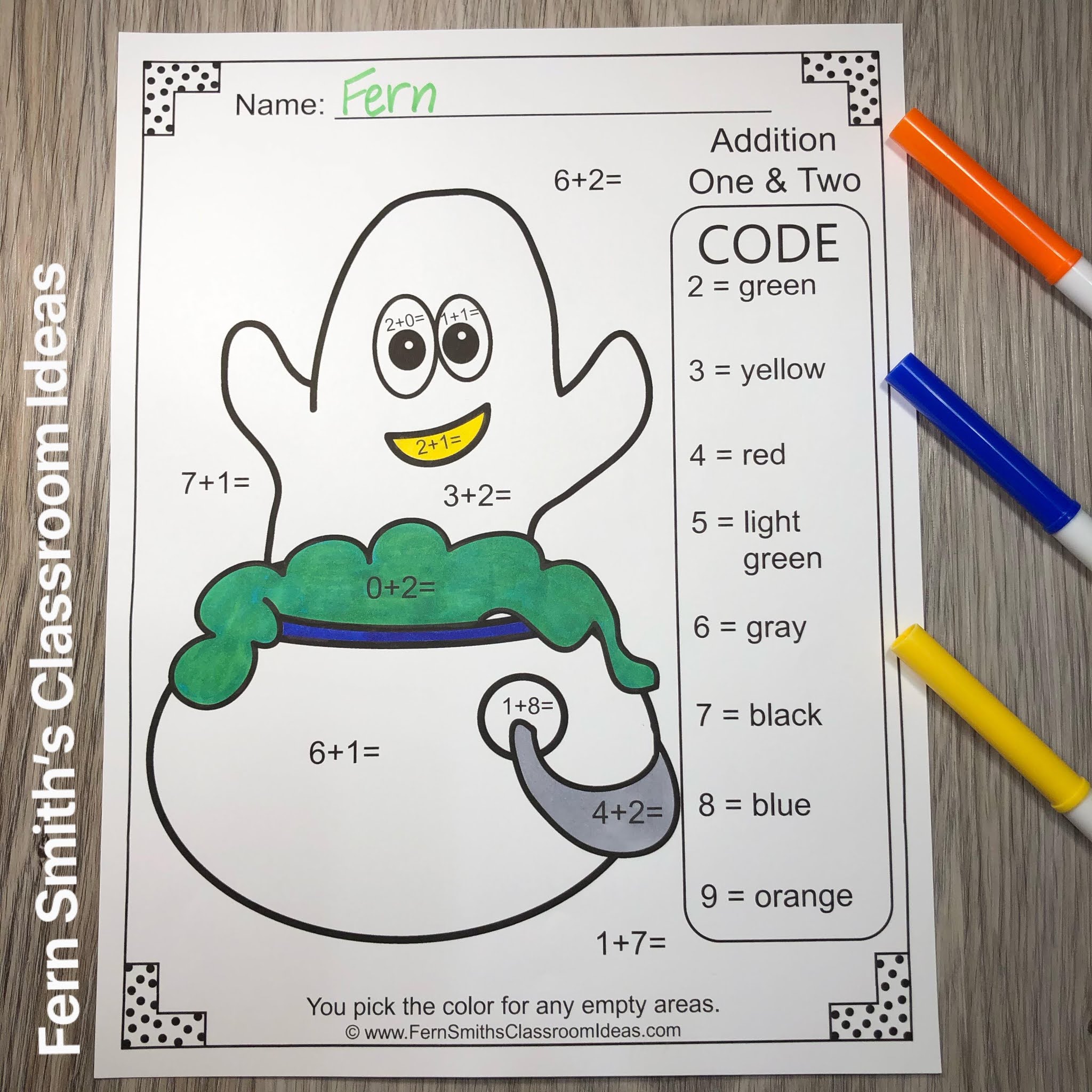 - Page Two - Mixed Addition is what is included on this Halloween Color By Number Page. This adorable Halloween Color By Number page has a sweet little smiling ghost popping out of a bubbling cauldron he is just ready to spend Halloween with your boys and girls!