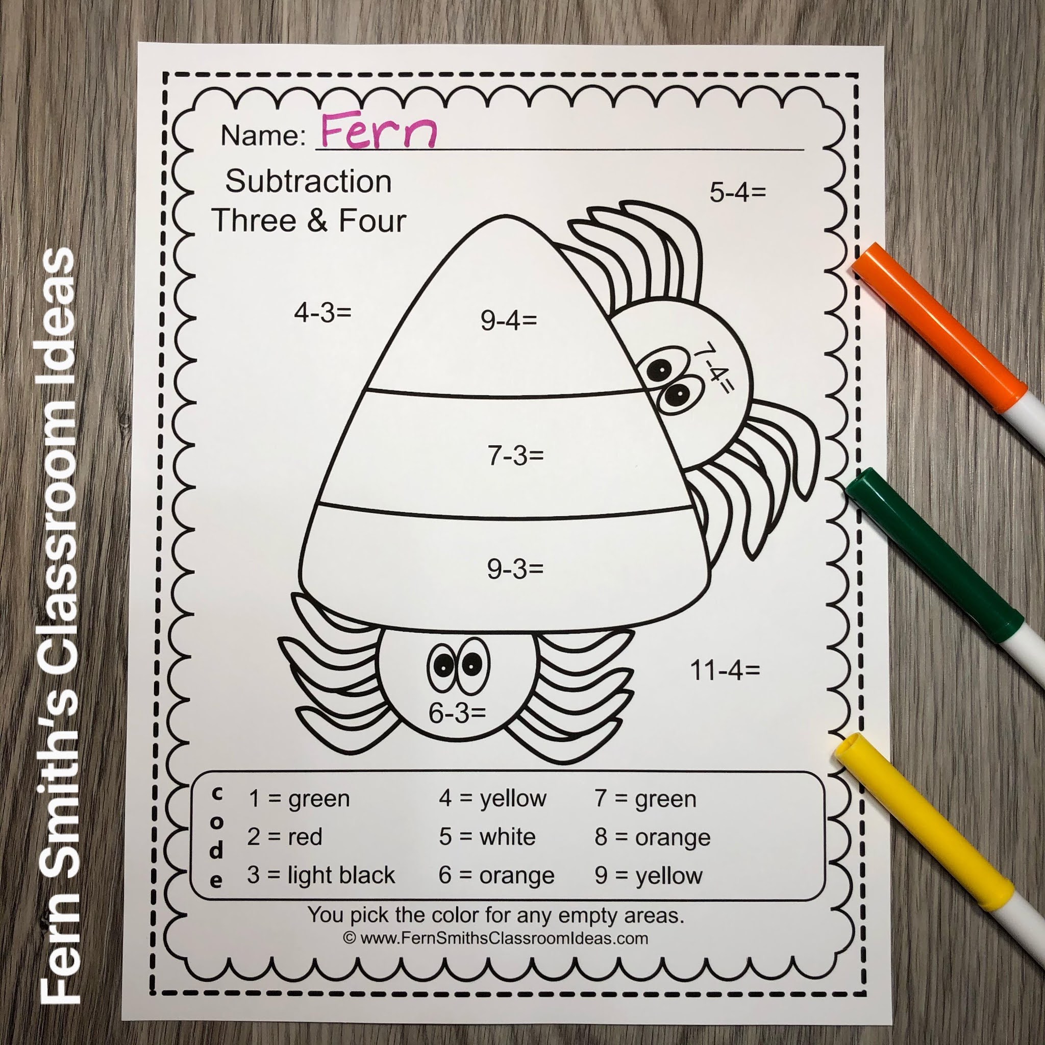 - Page Two - Mixed Subtraction is what is included on this Halloween Color By Number Page. This adorable Halloween Color By Number page has variety of colorful Halloween candy for your class to practice their subtraction facts!