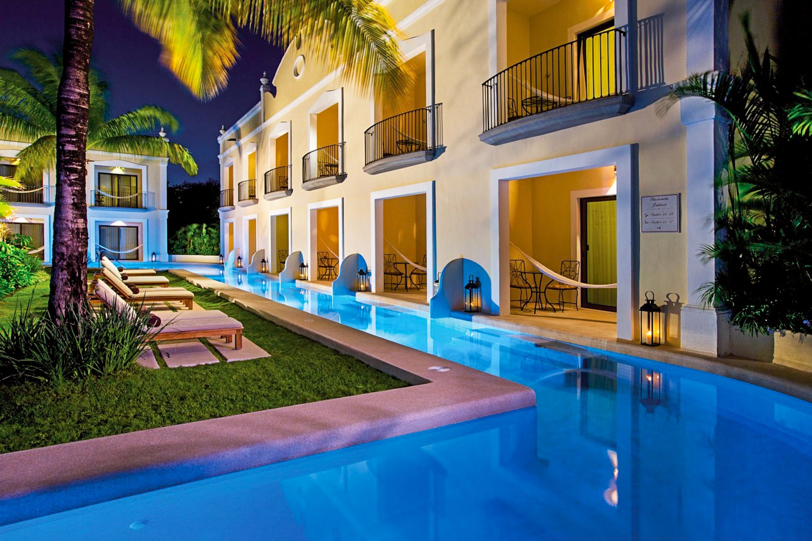 All rooms marry romance with a tropical vibe. Grouped in an attractive, white-washed two-story building, Casita Suites start at 708 square feet and feature thatched palapa roofs, outdoor showers, lashings of tropical wood, gauzy white drapes and large balconies with white-cushioned day beds.