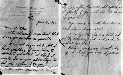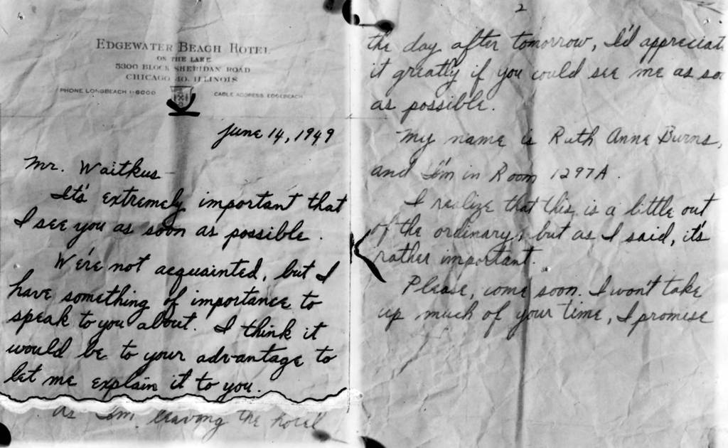 Written on hotel stationary, the note read: “Mr. Waitkus; It's extremely important that I see you as soon as possible. We're not acquainted, but I have something of importance to speak to you about. I think it would be to your advantage to let me explain it to you. As I am leaving the hotel the day after tomorrow, I'd appreciate it greatly if you would see me as soon as possible. My name is Ruth Ann Burns, and I am in room 1297a. I realize this is a little out of the ordinary, but as I said, its rather important. Please come soon. I won't take up much of your time, I promise.”