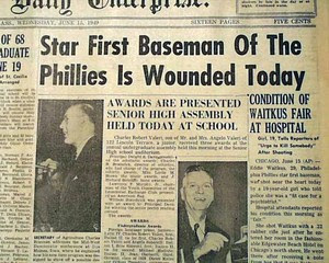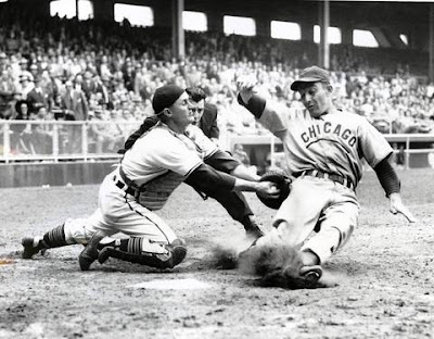 I might say the weather was prophetic. A thunderstorm blew in before dawn that Tuesday morning, 14 June, 1949 breaking a ten day dry spell. Still the sky remained so uninviting only 7,815 filed into Wrigley Field. But after noon the clouds parted, and by game time the sun was driving humid temperatures into the low eighties. Last place Chicago was hosting fourth place Philadelphia, but the real draw was the return of two popular players traded over the winter - pitcher "Mad Monk" Mayer and first baseman Eddie Waitkus.
