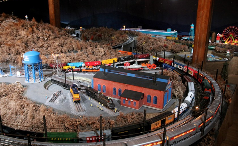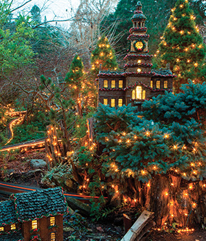 Visitors of all ages will be wowed by a quarter-mile of track featuring seven loops and tunnels with fifteen different rail lines and two cable cars, nine bridges (including a trestle bridge you can walk under), and bustling model trains, all set in the lovely winter garden of the Morris Arboretum. The display and buildings are all made of natural materials – bark, leaves, twigs, hollow logs, mosses, acorns, dried flowers, seeds, and stones – to form a perfectly proportioned miniature landscape complete with small streams. Each building, while an exact replica of the original, is unique in its design. Philadelphia-area landmarks, such as a masterpiece replica of Independence Hall, are made using pine cone seeds for shingles, acorns as finials, and twigs as downspouts.