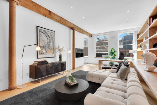 Now on the market asking $2,500,000, this full-floor loft co-op at 137 West Broadway in Tribeca recently served as the office, art studio, and pied-à-terre of renowned late architect Rafael Viñoly. Viñoly, who designed notable buildings like 432 Park Avenue, 277 Fifth Avenue, and Three Waterline Square, kept the space until his passing in March of this year, overseeing renovations and using the living room walls to create life-sized figure drawings on wall-sized sketch pads.