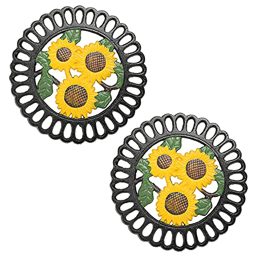 Strong heat insulation decorative and practical design solid cast iron material prevent slippery and heat insulation With them your kitchen surface countertop desktop mesa wont be burnt by the high heat pan pot any more What will you get package include 2 pack trivets with rubber feets Our trivets will add charm to your kitchen and dinner table while protecting your furniture and countertop from hot dishwares Pls kindly check the size in detail before you purchase