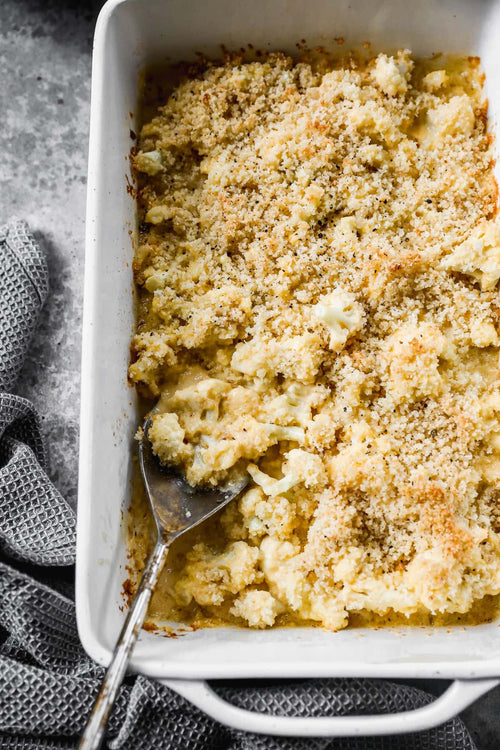 Make the topping: In a small bowl, melt the butter. Add the Panko and Parmesan. Stir to combine, then sprinkle evenly over the top of the cauliflower mac.