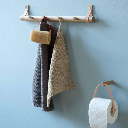 Above: Made of FSC-certified oak and tanned leather, By Wirth’s Rack comes with four (850 DKK) or six pegs (1,050 DKK) and can be put to use in just about every room in the house. In the bath, it pairs well with the brand’s Toilet Paper Holder; 375 DKK. Above: Another companion piece to the Toilet Paper Holder, the Double Loop Hanger (315 DKK)—an oak hook with two leather straps—can be used for hanging all sorts of things, including magazines or towels. Above: By Wirth’s Towel Hanger is a larger, more triangular version of the toilet paper holder; both have leather straps that are slotted into oak pegs; 420 DKK.