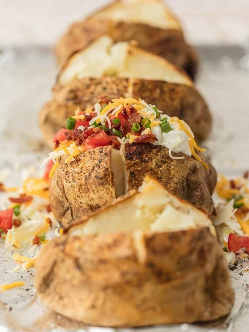 Top the potatoes with your favorite baked potato toppings and serve. Enjoy!Butter, Sour Cream, Shredded Cheese, Bacon crumbles, Chives, Green Onions, Tomatoes, Cooked broccoli, Sautéed onions, Caramelized onions, Cooked Hamburger or Sausage, Chili, Goat Cheese, Sautéed mushrooms, Grilled or Rotisserie Chicken