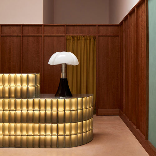 At the back, illuminated glass bricks are stacked within a steel structure to form a curved counter, upon which a curvaceous Pipistrello Table Lamp by Italian architect Gae Aulenti is placed.