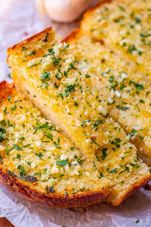 This first method is my favorite way to make garlic bread. I love a good crispy edge with buttery layers that shatter when you bite in, and a soft buttery center.