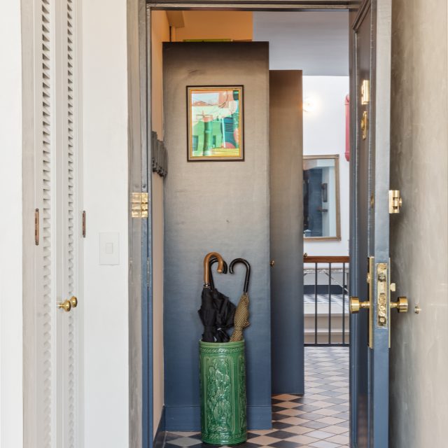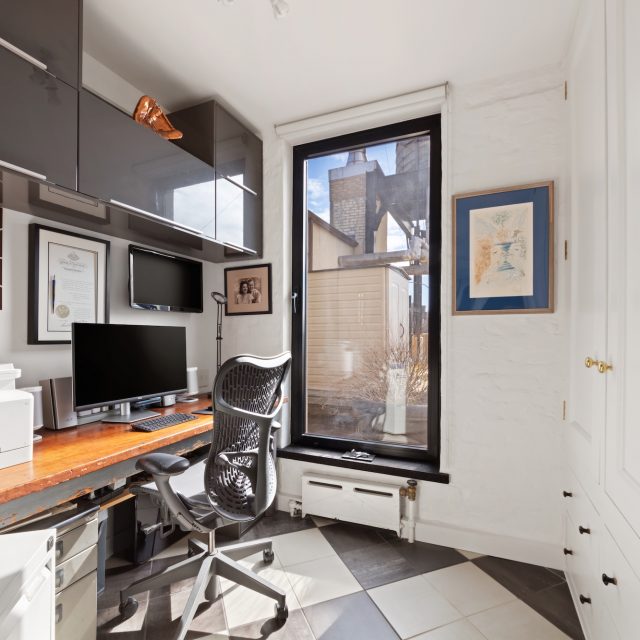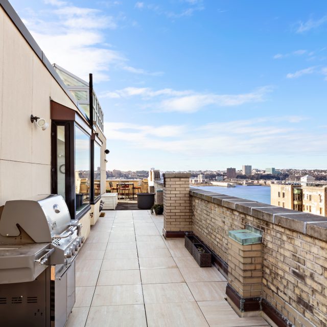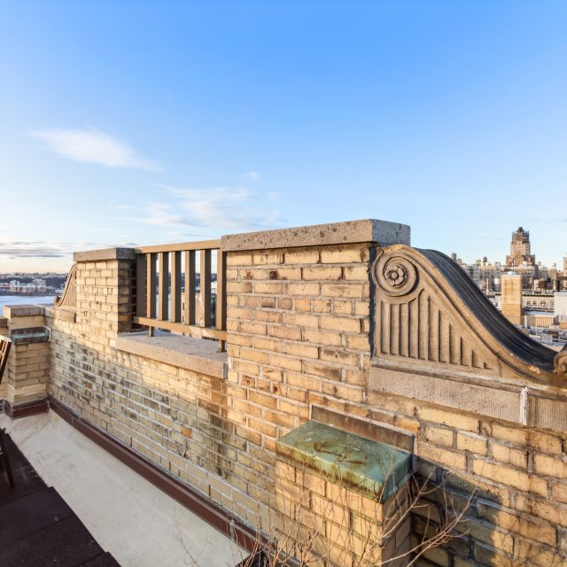 Three skylights illuminate the home from above; full-height casement doors and windows offer iconic skyline and river views in all directions. From Venetian plaster walls and abundant millwork to marble tile in the kitchen, materials used to create the space blend seamlessly with the pre-war building, designed in 1925 by noted architect Rosario Candela as one of 16 surrounding Candela-designed buildings.