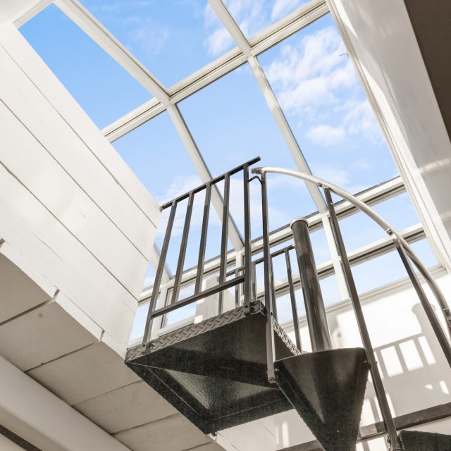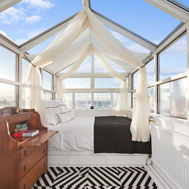 The most exquisite detail of this unusual home awaits at the top of a spiral staircase that rises from the living room. The penthouse-to-the-penthouse, if you will, is a glass-wrapped solarium that serves as an office/den/bedroom in the sky, with 360-degree views of the city and the river.